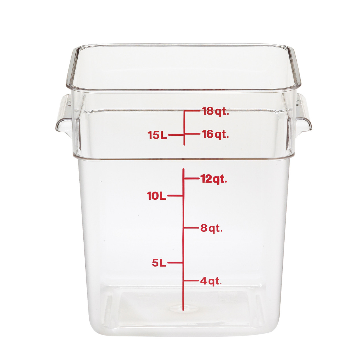 Food Container, 18 qt., 11-1/4"L x 12-1/4"W x 12-5/8"H, with handles, red graduation, polycarbonate, dishwasher safe, resists stains & odors, clear, NSF